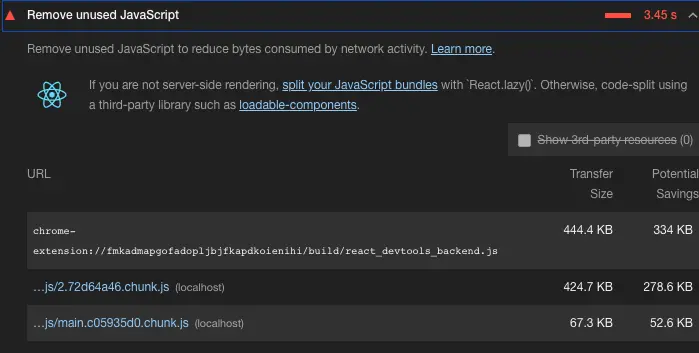 Code splitting allows your application bundle to be split into multiple independent bundles called chunks. You can think of chunks as asynchronous modules that are only requested by the client when they are required. So, how does this help solve the unused code error that Lighthouse is reporting?