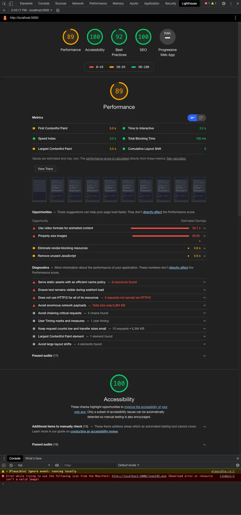 Leveraging code splitting, our score jumped 46 points to a total of 89, which is pretty impressive considering the amount of effort that was required to do so. This change puts the application on the edge of a good rating.